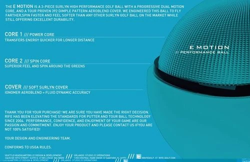The Rife E-Motion 3-piece ball has been designed with a Progressive Motion Dual Core to fly farther, spin faster, and feel softer all while offering greater durability. Our proprietary Aeroblend Cover features Aerocontrol parallel dimple dividers for increased flight distance and stability while roll promoting dimples enhance putter feel and confidence.