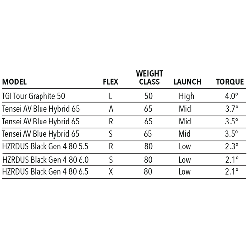 No Upcharge Custom Shaft Specs: